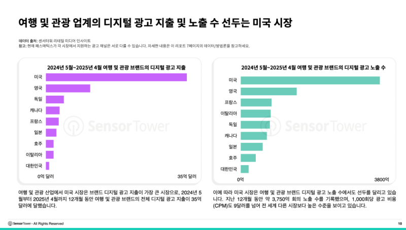 여행 및 관광 산업에서 미국 시장은 브랜드 디지털 광고 지출이 가장 큰 시장으로 20245월부터 20254월까지 12개월 동안 여행 및 관광 브랜드의 전체 디지털 광고 지출이 35억달러에 달했다. 이에 따라 미국 시장은 여행 및 관광 브랜드 디지털 광고 노출 수에서도 선두를 달리고 있다. 지난 12개월 동안 약 3750억 회의 노출 수를 기록했으며 1000회당 광고 비용(CPM)9달러를 넘어 전 세계 다른 시장보다 높은 수준을 보이고 있다.