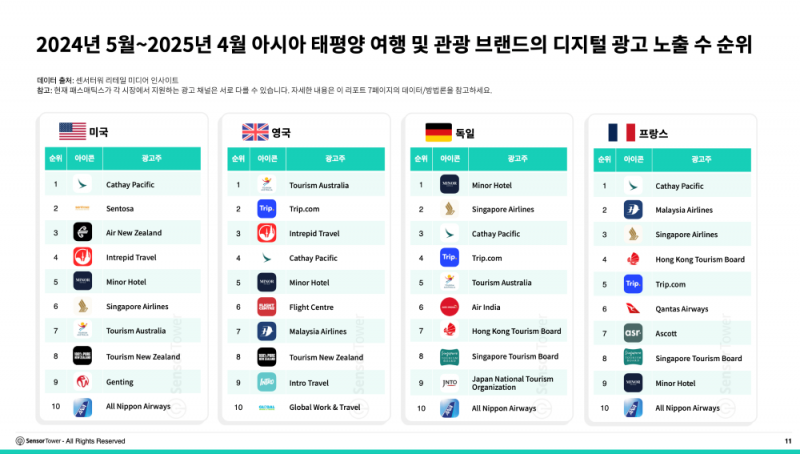 글로벌 마켓 인텔리전스 기업 센서타워가 미국, 영국, 호주 등 시장에서 여행 및 관광 브랜드의 디지털 광고 지출 및 노출 수 추세와 함께 주요 시장에서 아시아 태평양 여행 및 관광 브랜드의 디지털 광고 노출 수 순위, 그리고 전일본공수, 캐세이퍼시픽, 싱가포르항공, 롯데그룹 등 사례 분석을 포함한 ‘2025년 아시아 태평양 여행 및 관광 브랜드의 디지털 광고 인사이트리포트를 발표했다.