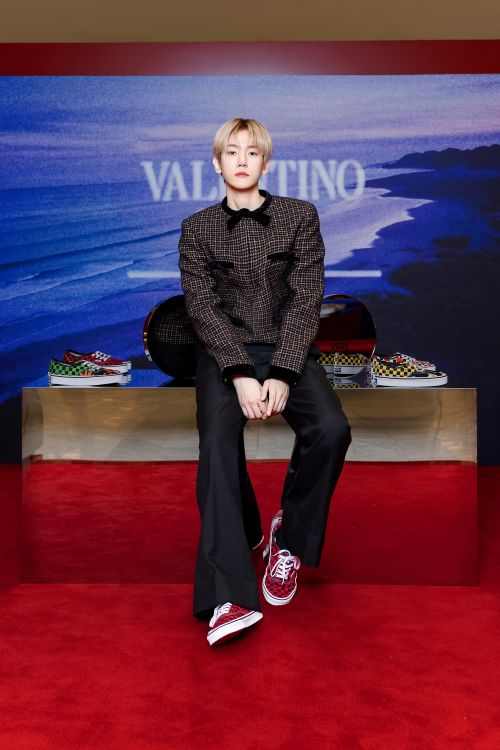 엑소 멤버 겸 솔로 아티스트 백현은 보우 디테일과 벨벳 소재가 돋보이는 피에 드 풀 재킷에 블랙 개버딘 팬츠를 매치해 감각적인 룩을 선보였다. 발렌티노 가라바니 브이로고 시그니처 벨트와 발렌티노 가바라니 호보호 백, 그리고 발렌티노 가라바니와 반스의 협업으로 선보이는 스니커즈로 스타일링을 완성했다.