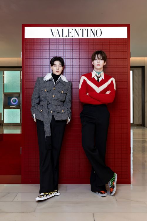 제로베이스원의 성한빈은 레드와 아이보리 컬러가 어우러진 브이넥 울 스웨터에 아이보리 코튼 셔츠, 울 터틀넥 스웨터, 블랙 팬츠를 매치해 인상적인 룩을 선보였다. 뒷 면의 브이로고 보우 디테일이 돋보이는 울 스웨터에 아이보리 코튼 셔츠, 울 터틀넥 스웨터와 블랙 팬츠를 매치했으며, 파피에 플로럴 패턴의 타이와 함께, 발렌티노 가라바니와 반스의 협업으로 선보이는 스니커즈, 발렌티노 가라바니 호보호 백을 더해 개성 있는 룩을 연출했다.