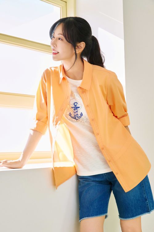 화보 속에서 김소연이 착용한 ‘여성 아우터형 카라 블라우스’는 코튼 혼방 소재로 된 오렌지 컬러의 가벼운 셔츠로 허리 절개 라인 포인트를 통해 텐션감이 우수한 것이 특징이다. 함께 코디하면 좋을 착장으로 선보인 ‘데님 와이드 반바지’는 허리 밴드가 있어 착용감이 편하고 통기성이 좋은 제품이다.