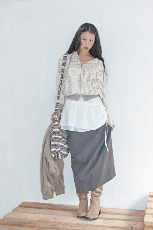 이번 컬렉션에서는 경쾌한 크롭 기장과 밴딩 디테일에 버튼 포인트로 캐주얼 감성을 표현한 크롭 블루종 체크 패턴 겉감에 솔리드 패턴 배색으로 대비를 준 체크 후드 점퍼 주머니 참 장식으로 특별함을 더한 스트라이프 후드 집업 어깨 라인부터 밑단까지 내려오는 버튼 장식이 특징인 스터드 후드 집업 등으로 구성됐다.