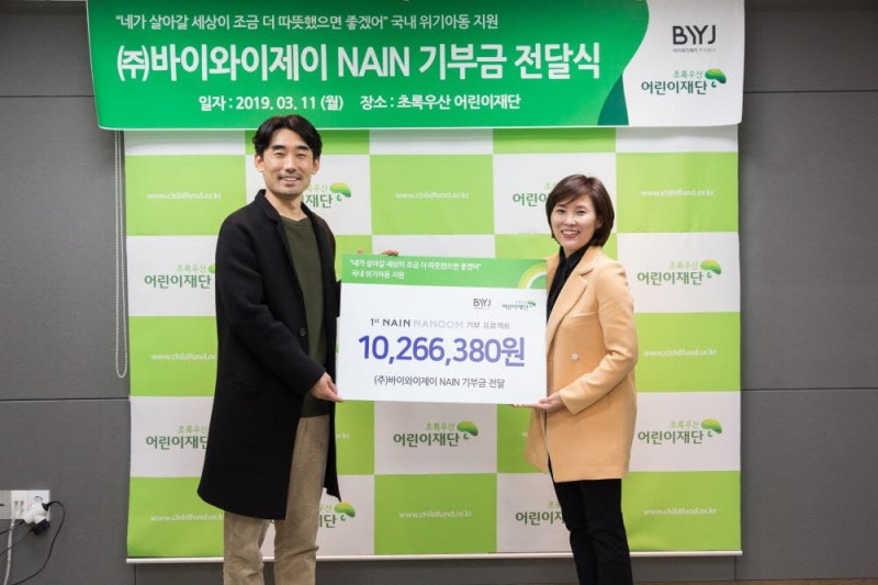 바이와이제이(대표 김영근)가 지난 121일부터 23일까지 3일간 공식 온라인몰(nain.co.kr)에서 진행되었던 나인나눔 프로젝트 ‘Giving LOVE, with NAIN’ 판매수익금을 초록우산 어린이재단에 전달하고 지난 11일 기부금 전달식을 진행했다.