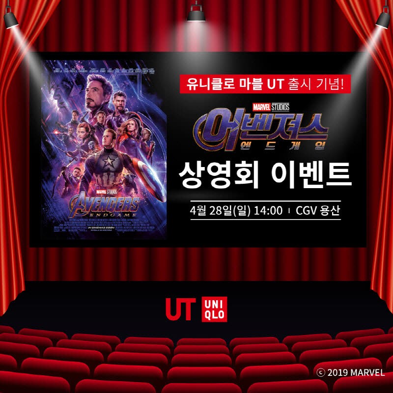 ‘유니클로’는 어벤져스 네 번째 시리즈인 영화 ‘어벤져스: 엔드게임’ 개봉을 기념하며 4월 28일(일) CGV 용산 UT 특별관에서 유니클로 UT와 함께하는 영화 <어벤져스: 엔드게임> 상영회를 개최, 현장에서 기념사진을 촬영할 수 있는 포토월과 참가자들을 대상으로 특별한 경품을 증정하는 퀴즈 이벤트 등 다양한 프로그램을 진행, 총 186명의 참가자들에게 이번 시즌 출시되는 ‘마블 UT’를 증정한다.