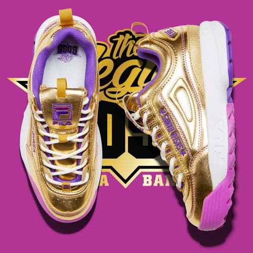 먼저 ‘휠라’ 디스럽터2 X 사샤 뱅크스 버전은 메탈릭 골드 컬러와 일렉트릭 퍼플 컬러가 가미된 슈즈에 사샤 뱅크스의 이름과 뱅크스의 별명인 'The Legit Boss'를 신발 곳곳에 새겼다.