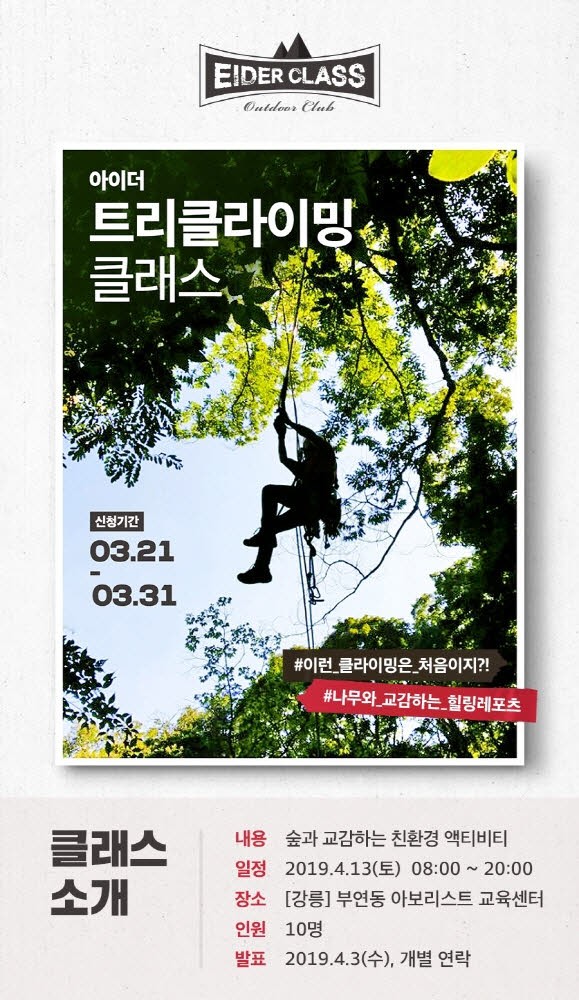 트리클라이밍은 오는 413일에 진행되며 자연과 만나는 새로운 스타일의 클라이밍을 배워보고자 희망하는 사람이라면 누구나 신청 가능하다. 신청은 아이더공식 블로그(eiderblog.co.kr)를 통해 오는 331일까지 응모하면 된다. 신청자 중 추첨을 통해 총 10명의 참가자를 선발하며 당첨자 발표는 43일 개별 통보될 예정이다.