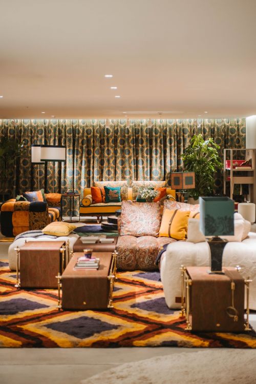 우드스톡 소파, 퀼타나 암체어, 프레임 로우 테이블, 리드 암체어 등 아이코닉한 가구들이 다채로운 프린트와 컬러로 조화를 이루며, 세련되고 이국적인 공간을 연출한다.