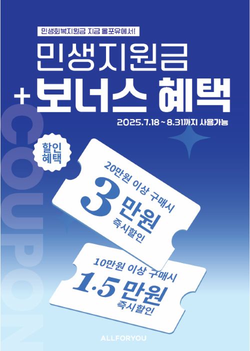 한성에프아이가 21일부터 시행되는 정부의 민생회복 소비쿠폰 정책에 발맞춰 지역경제 활성화에 동참하고자 ‘올포유’의 민생지원금 플러스 보너스 혜택 프로모션을 진행한다.
