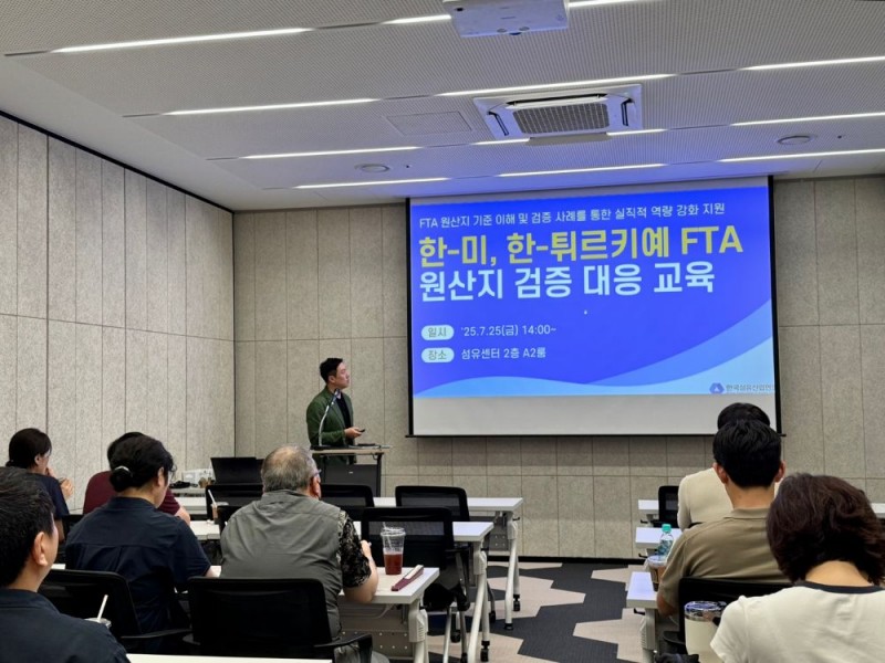 한국섬유산업연합회(회장 최병오)가 지난 7월 25일 14시부터 섬유센터 2층 Tex+Fa Campus에서 섬유패션 수출기업 임직원 50여명이 참석한 가운데 ‘한-미, 한-튀르키예 FTA 원산지 검증 대응 교육’을 개최했다.