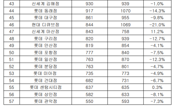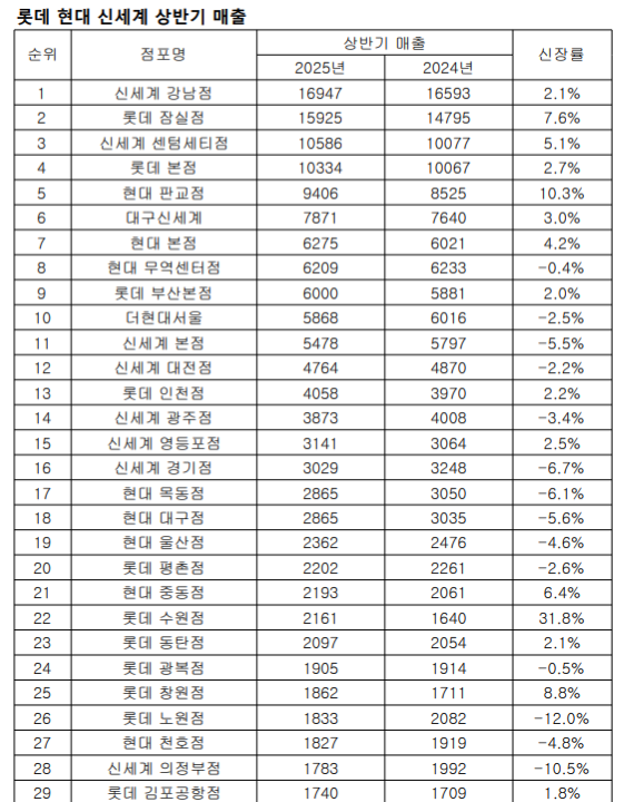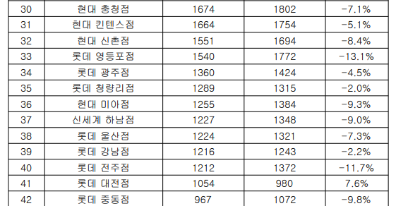 또 신세계 센텀시티점이 1조586억원(5.1%), 롯데 본점 1조334억원(2.7%), 현대 판교점9406억원(10.3%), 대구신세계 7871억원(3%), 현대 본점 6275억원(4.2%), 현대 무역센터점 6209억원(-0.4%), 롯데 부산본점 6000억원(2%), 더현대서울 5868(-2.5%)로 톱10에 이름을 올렸다.