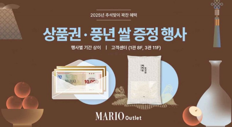 먼저 103일부터 12일까지 진행되는 한가위 사은행사에서는 마리오아울렛 멤버십 고객이 30만원, 60만원, 90만원 이상 구매 시 각각 1만원, 2만원, 3만원의 마리오 상품권을 받을 수 있다. 또한 15만원 이상 구매 고객에게는 마리오 농장쌀(1kg)을 증정한다.