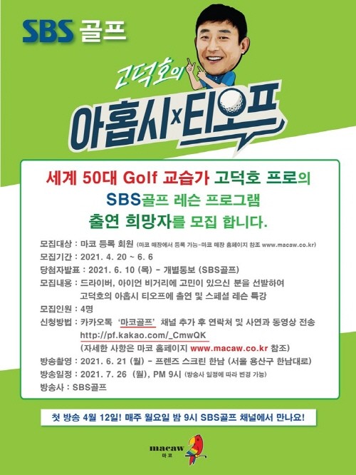 모집은 드라이버, 아이언 비거리에 고민이 있는 아마추어 골퍼 4명을 선정한다. 신청방법은 카카오톡 채널 ‘마코골프’ 검색 후 채널 추가 후 연락처 및 사연과 문제가 되고있는 스윙 동영상을 카카오톡으로 전송하면 자동 신청되며 방송 촬영은 6월21일 용산구 한남동에 위치한 프렌즈 스크린에서 진행된다.
