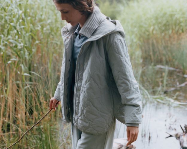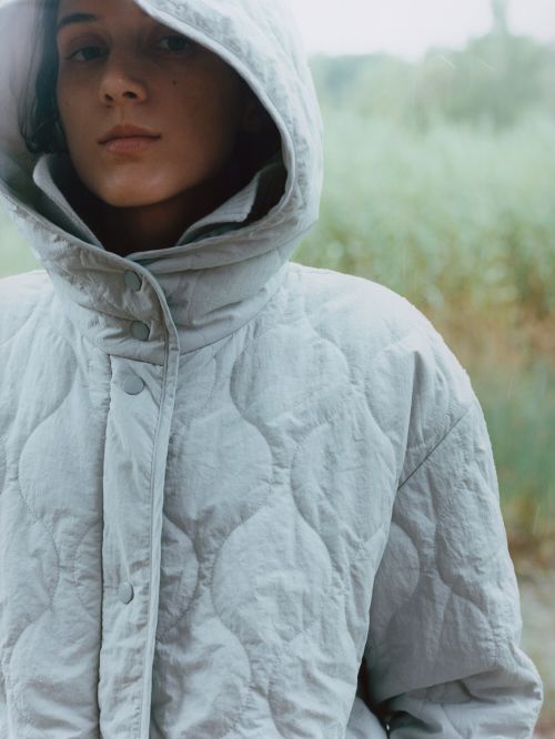 경량 패딩 아이템 코지 패딩 후드 자켓은 가벼운 경량 나일론 원단에 자연스러운 주름을 내기 위해 물빨래를 하는 와셔 가공 처리로 입을 때 부드러운 촉감을 느낄 수 있다. 물결이 치는 듯한 퀼팅의 곡선형 디자인, 답답한 느낌 없이 넉넉하게 쓸 수 있는 후드, 둥근 밑단 끝 처리 등 감성이 묻어나는 섬세한 디테일과 부드러운 색감이 어우러져 나우만의 무드를 담은 점이 특징이다.