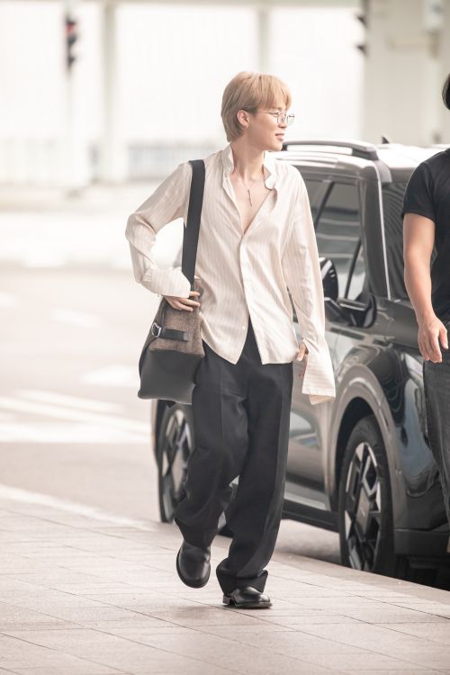 지민의 공항패션을 완성시켜 준 룩은 ‘디올’ 제품으로 알려졌다. Dior Summer 26 컬렉션 핑크 스트라이프 트윌 셔츠로 컬러감에 포인트를 주면서 블랙 첼시 부츠와 브라운 울 메신저 백을 함께 매치해 클래식함을 더해주었다.