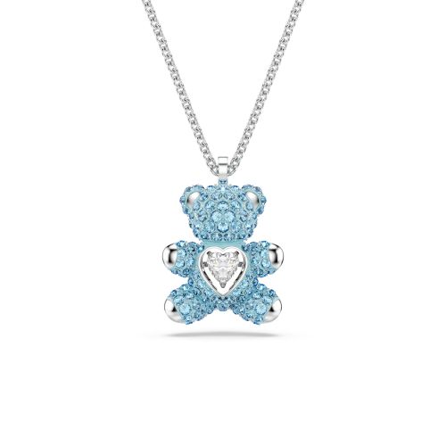 팬던트는 3D 테디 베어 디자인에 아쿠아 블루 컬러 크리스털 포인티아주가 섬세하게 장식되었으며 투명한 클리어 크리스털 하트 쉐입의 댄싱 스톤센터피스가 생동감 있는 반짝임을 선사한다. 마지막으로 로듐 도금 체인으로 마무리해 고급스러움과 내구성을 동시에 갖췄다.