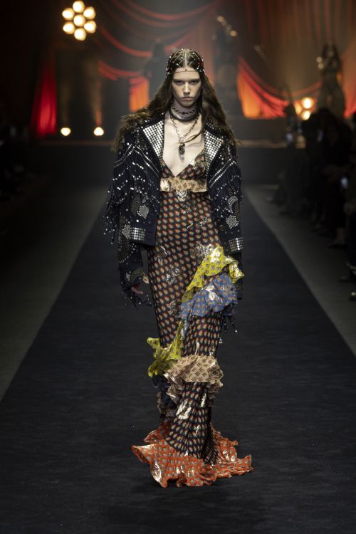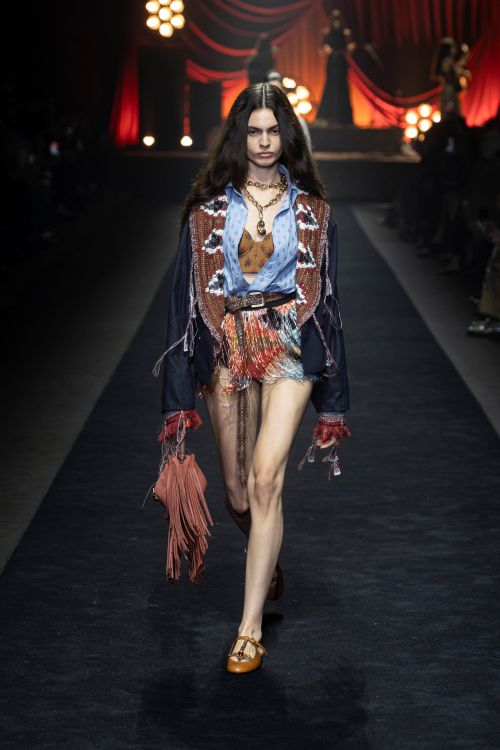 가죽 바이커 재킷과 스웨이드 코트에 프린지 장식을 더했고 브랜드만의 정체성이 돋보이는 프린트에 비즈 프린트를 더해 반짝임을 강조했다. 메탈릭 자카드는 리드미컬한 패턴과 겹쳐지며 다채로운 컬러는 러플의 대비 속에서 더욱 돋보인다. 가죽 블루종에는 다색 인레이가 더해지고 브로케이드에는 회화적인 모티프가 꽃피우듯 장식된다. 블랙 컬러는 불현듯 등장해 강렬하면서도 유연하게 스며들며, 컬렉션의 흐름을 한층 선명하게 드러낸다.