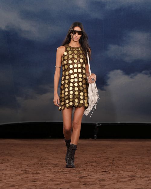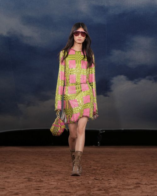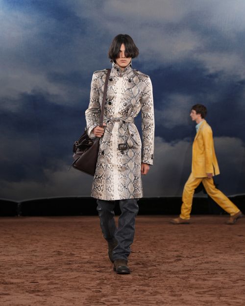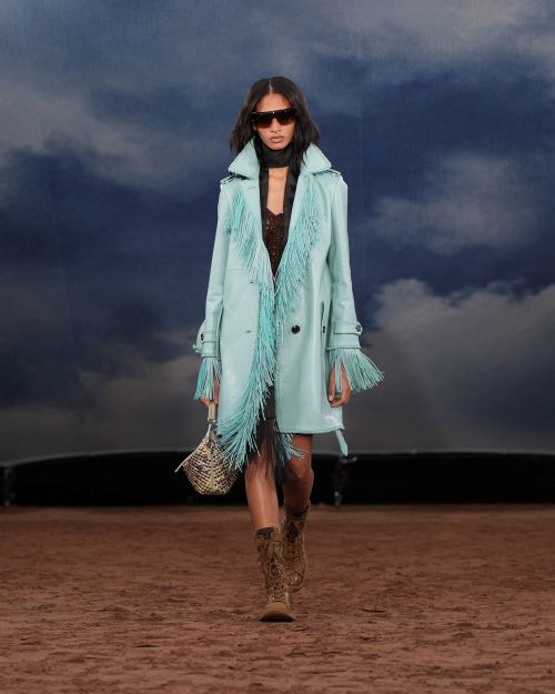 레인코트는 코튼과 라피아 질감을 혼합해 경쾌한 체크 패턴으로 직조되었고 스웨이드와 가죽 코트는 파이톤 프린트, 페이즐리 레이저 컷, 스티치와 프린지 디테일로 완성되었다.