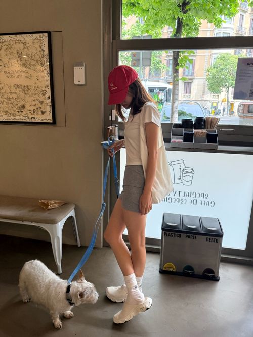 마지막으로 애슬레저룩, 이너로 착용하기 좋은 베이직 레깅스 쇼츠와 심플한 로고의 누아르 수피마 티셔츠는 편안한 착용감은 물론이고 조식, 산책 등 리조트 내의 힐링 속에도 스타일을 잃지 않는 조합이다.