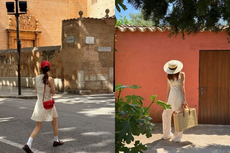 첫 번째로 여행지에서 스타일을 놓칠 수 없다면 ‘누아르나인’의 원피스를 선택해 보자. 가볍고 부드러운 촉감의 브이넥 플라워 드레스는 휴양지에 잘 어울리는 잔잔한 플라워 패턴이 사랑스러우면서 A 라인으로 떨어져 단독으로 입으면 로맨틱한 무드가 돋보이고 하의로 실키 밴딩 팬츠를 매치하면 활동성 있으면서 세련된 분위기를 연출해 준다.