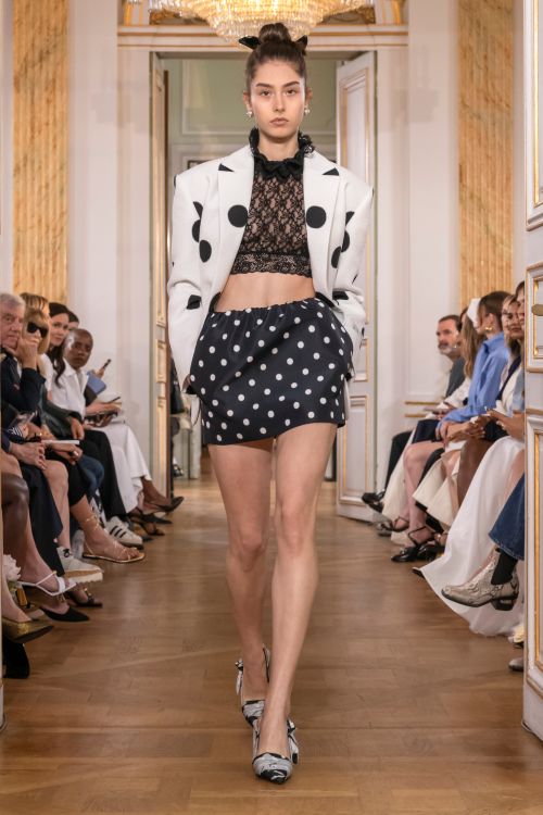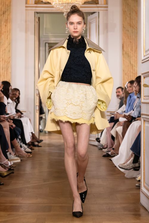 대표 착장으로는 라일락 핑크 컬러의 버튼업 트위드 재킷과 단정한 H라인 스커트로 구성된 ‘트위드 셋업’이 눈길을 끌었다. 페미닌하면서도 클래식한 무드를 현대적으로 재해석한 룩으로 브랜드의 꾸뛰르 감성을 잘 드러냈다. 이와 함께 섬세한 플로럴 레이스 소재의 미니 드레스, 파스텔 톤의 미니스커트에 가벼운 트렌치코트를 매치한 경쾌하고 생기 있는 룩도 소개됐다.