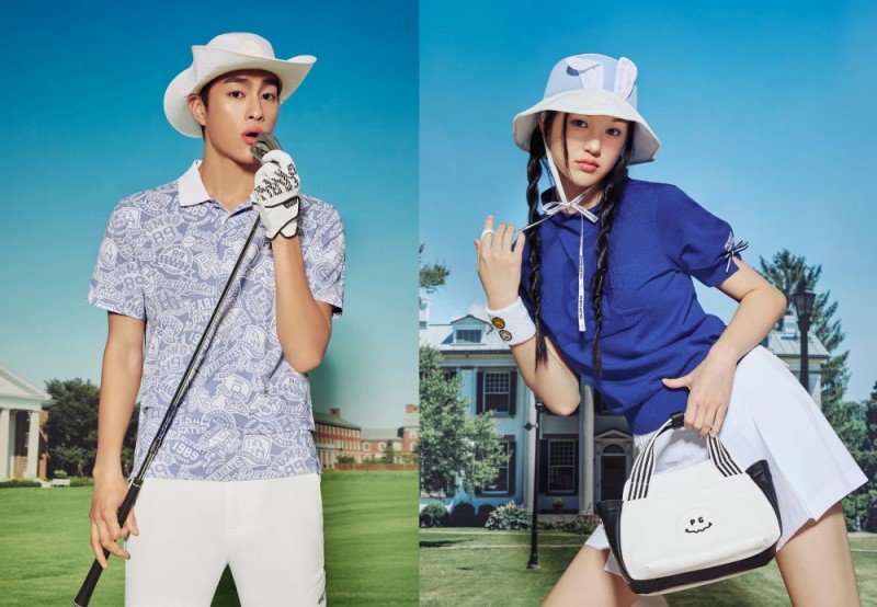 여자 모델은 퍼프 소매와 리본 디테일로 여성스러움을 더한 메쉬 반팔 니트를 착용했다. 블루 컬러로 청량감을 더하고 전체 메쉬 조직으로 산뜻한 착용감을 제공하며 화이트 플리츠 스커트와 시어서커 바니 바이저, 스트라이프 카트백을 매치해 영하고 청량한 룩을 연출했다.