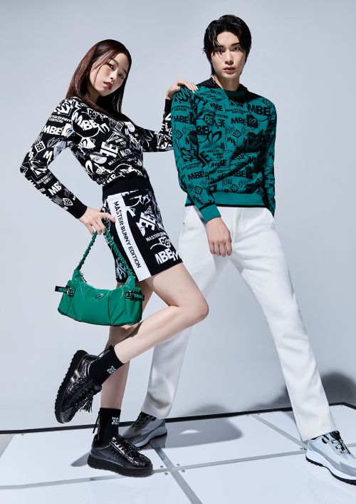 여자 모델은 블랙과 화이트의 대비감으로 강렬한 로고 플레이가 돋보이는 니트와 스커트 셋업을 착용해 개성 넘치는 스타일을 선보였다. 또한 메탈릭한 블랙 스니커즈와 그린 셔링 토트백을 매치해 경쾌한 분위기의 필드룩을 연출했다.